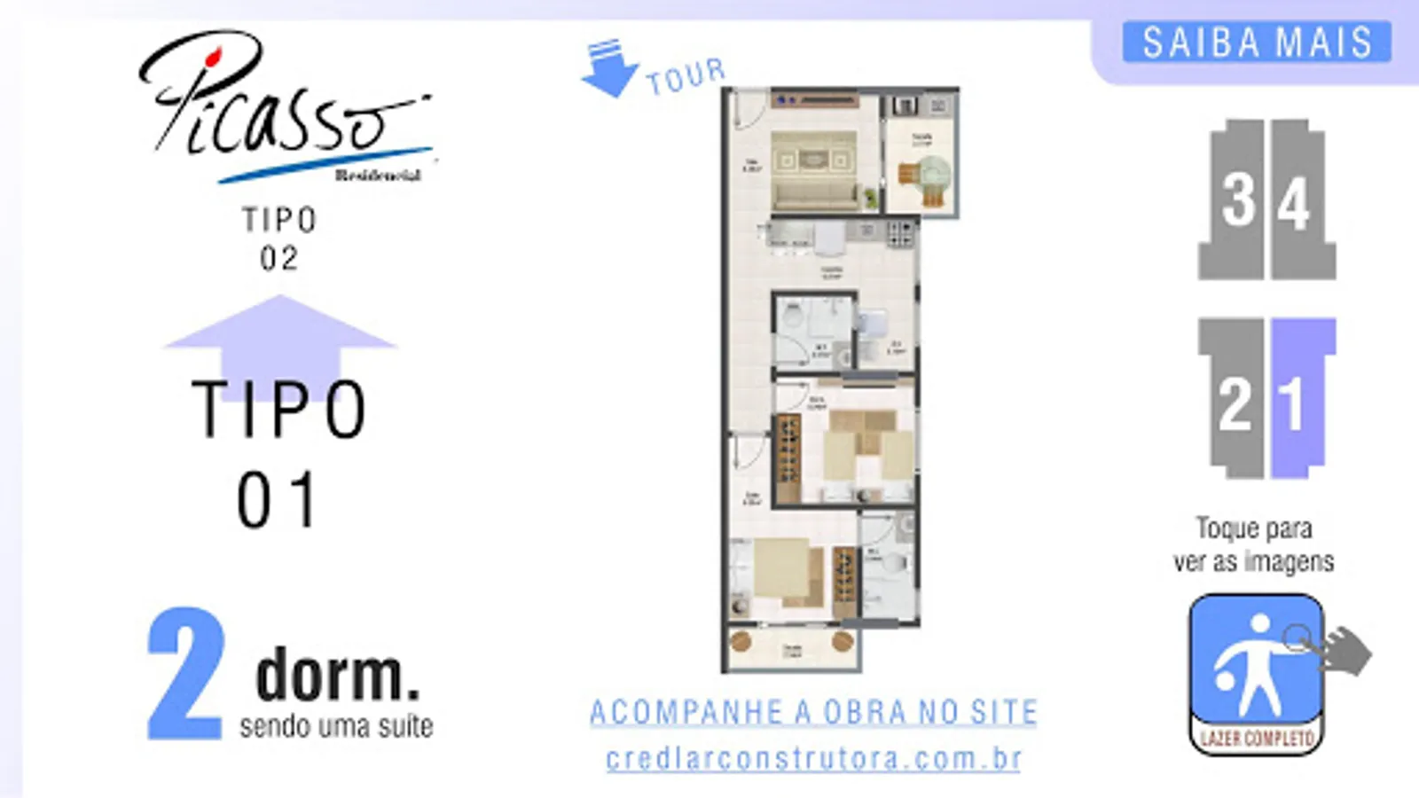 44 apartments with 02 bedrooms, 01 suite, living room, kitchen, WC, service area, balcony and 01 parking space.