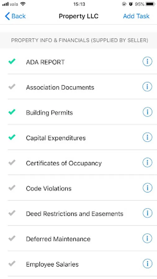 To add a deal, click the ‘+’ symbol, enter deal info, enter related contacts and start swiping! The app is pre-filled with the most common due diligence tasks. You can even add your own custom task.