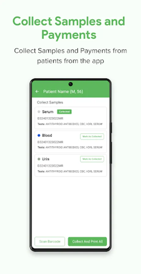 • Mark the samples collected directly from the app with support for pre-printed barcodes as well