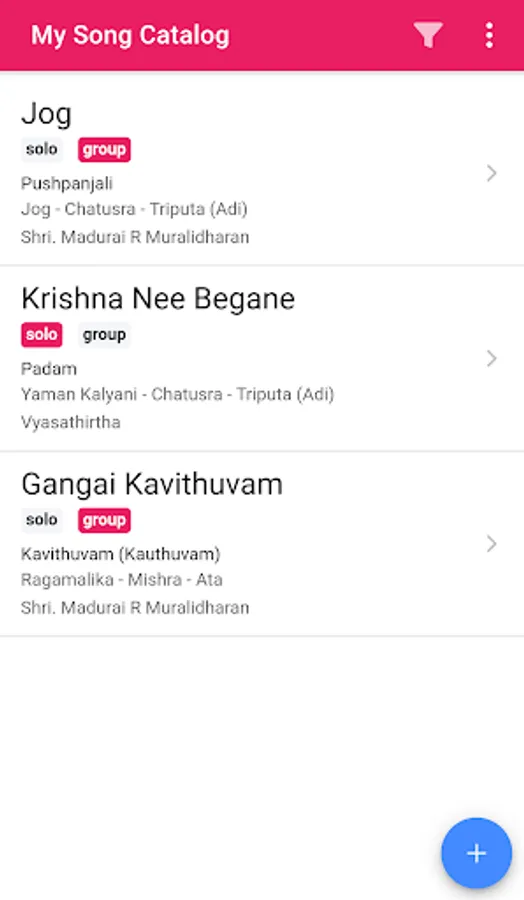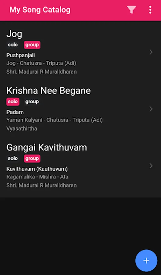 Quickly find that song by the specific composer needed for the next performance. Use the filter feature to find the song by name, ragam, talam, composer, or any other detail of the song.