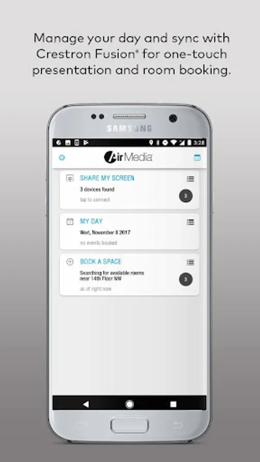 With Crestron AirMedia® you can walk into a room and wirelessly present slides, spreadsheets, documents, on-device videos and photos, even web pages and apps – all on the room display from your Android™ phone or tablet. With new full screen device mirroring, presenting directly from your favorite app is more intuitive and with better quality than ever before. The updated interface with optional Crestron Fusion® calendaring and PinPoint™ proximity beacon support allows for the fastest full-screen connection experience available – no more being tied to a laptop or podium. Requires a Crestron AirMedia wireless gateway (AM-101), or Crestron product with AirMedia built-in: Crestron Mercury™, DMPS3-4K-250-C, or DMPS3-4K-350-C. AM-100 users will need to install the AirMedia for AM-100 app.