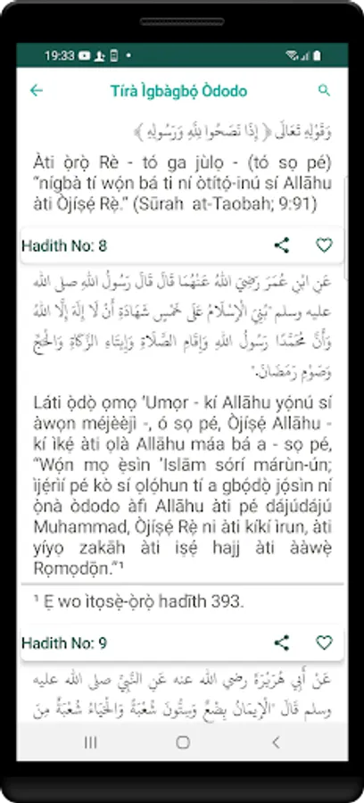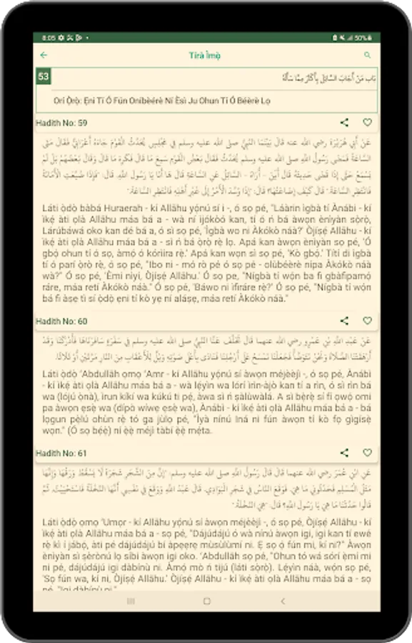 Hadith in Yoruba offers excellent Hadith study experience to all with translation in the Yoruba Language to aid understanding in Yoruba native Language, aside from its reach and fluent interface design with the simplicity allowing full explanation from the great scholars.