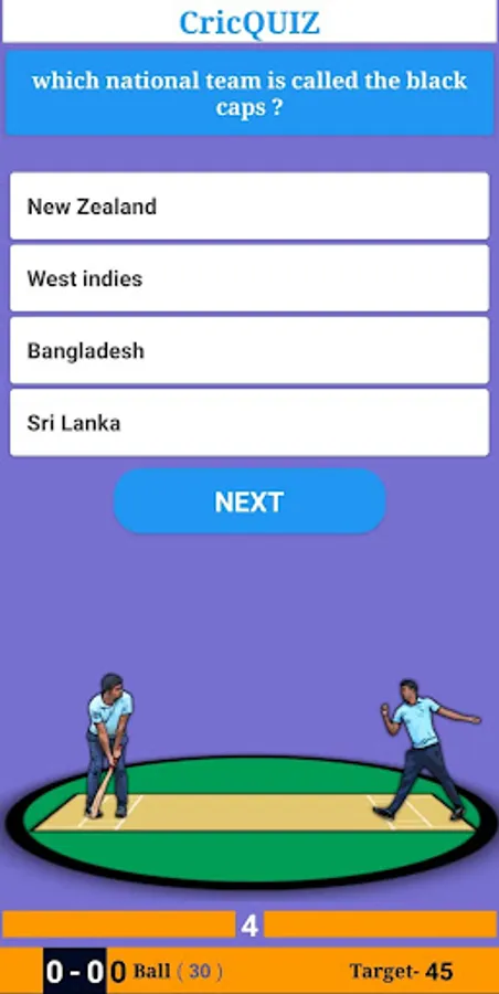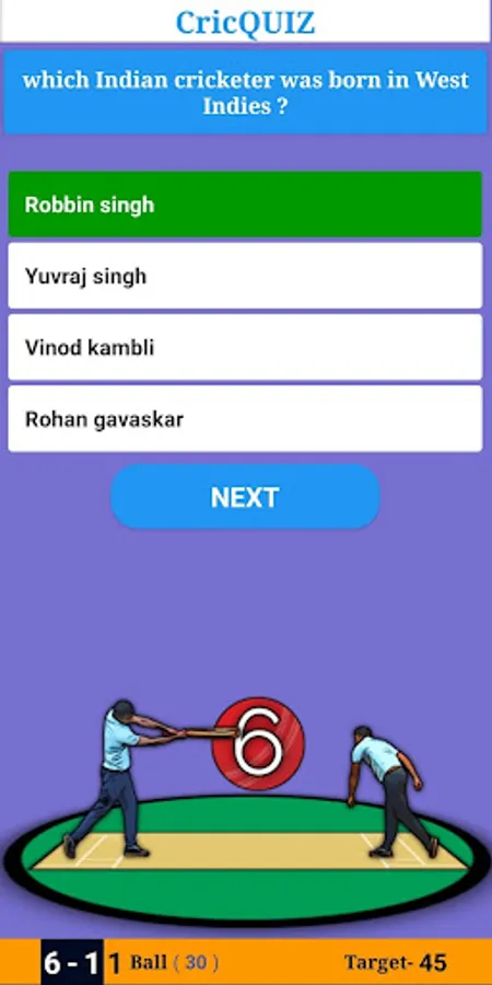 This game provides you all type of multiple choice cricket question and answer. In this game 5 overs and 10 over formats are there. A randum target will given to you. Answer within 2 second you will get 6 runs, answer within 2-4 second you will get 4 runs, Answer within 4 to 6 second you will get 2 and if you answer the question within 6 to 8 second you will get 1 runs. If your answer comes after 8 second you not get any runs for that. Every wrong answer will taken as OUT.