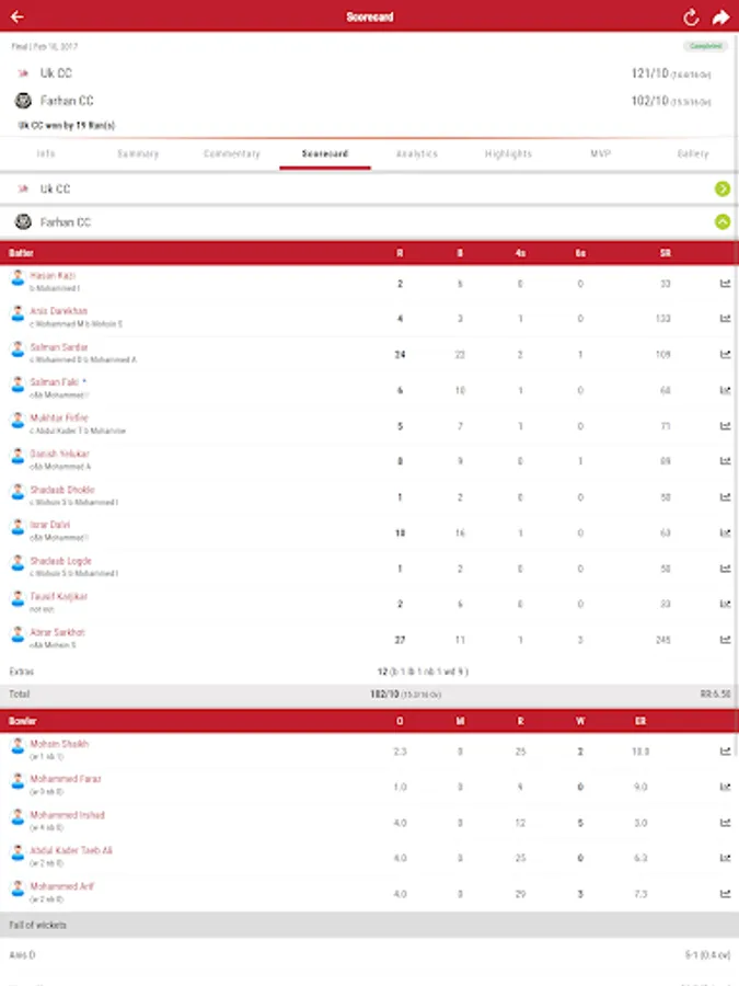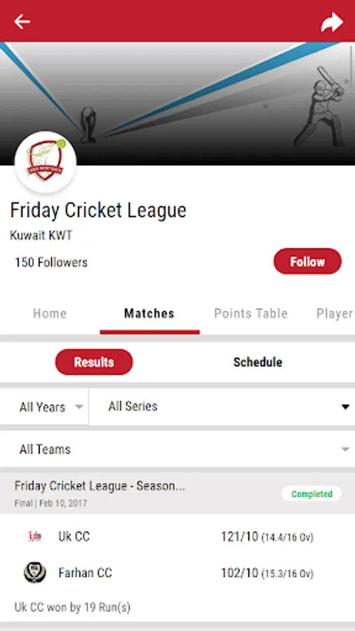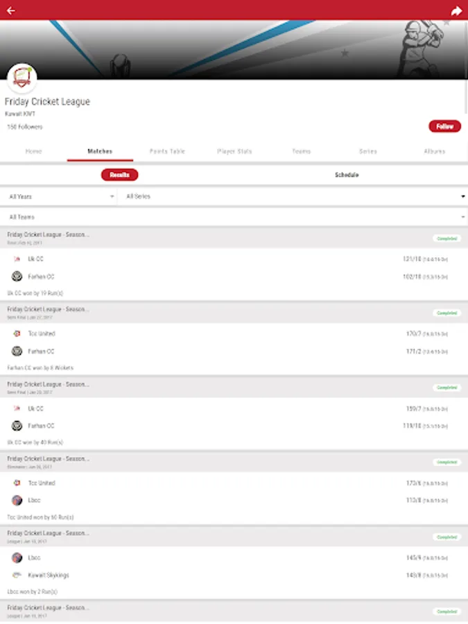 Powered by CricClubs, our platform allows you to get a complete insight dedicated to Friday Cricket League tournaments from schedules, live scores, results, statistics and news ranging from match reports and articles on the cricketing stars of Kuwait. You can also share your thoughts, achievements, and stories with your cricket-loving peers.
