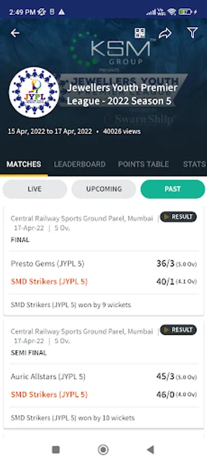 Players, organizers and followers of this Cricket tournament can follow the LIVE scores, Leader board, Boundary Tracker, Points Table and much more using this app. Scores are published LIVE ball to ball to this app. Enjoy!