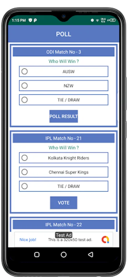 - Polls of all upcoming and recent matches.