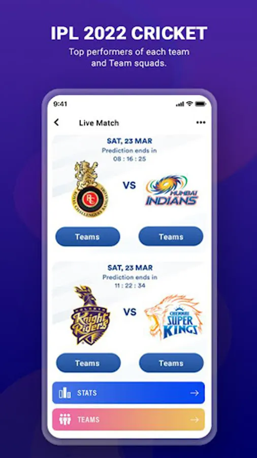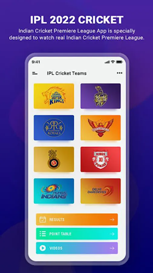 App has functionality cricket Live Score IPL team wise. You can check ipl schedules 2022 or matches of your favorite team. You can also read details and stats of your favorite ipl 2021 team.