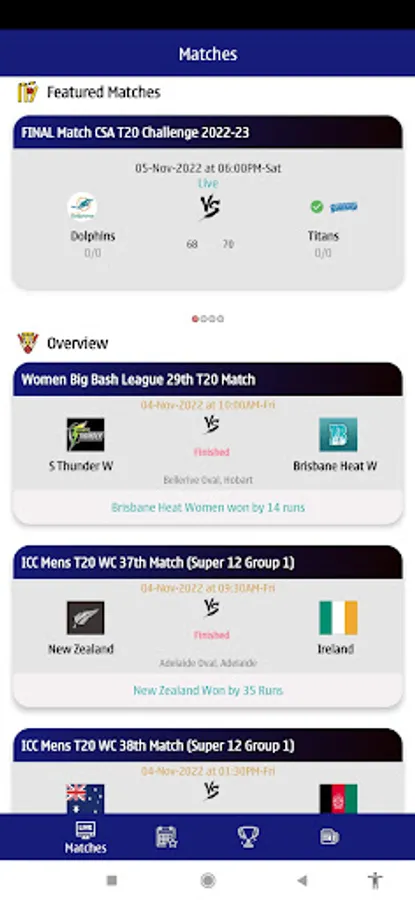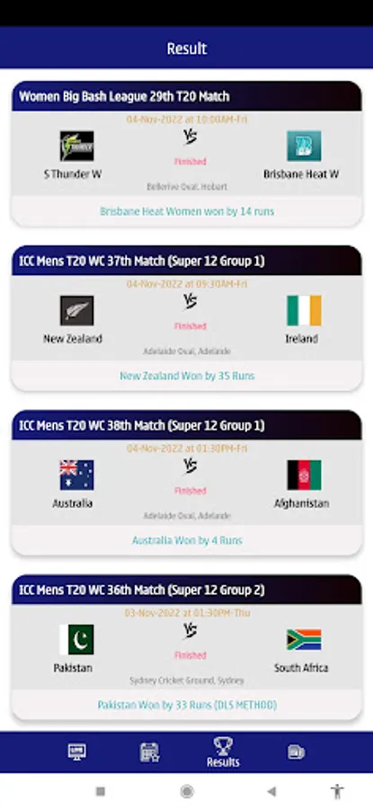 We have records of all recent and past Cricket matches results updated in this screen. You will able to check past matches scorecard according to the bilateral Cricket series, T20 Leagues and ICC World Cups.