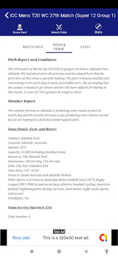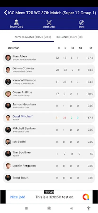 ✔ Main scorecard with teams total scored runs, wickets fallen and total overs played.