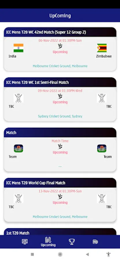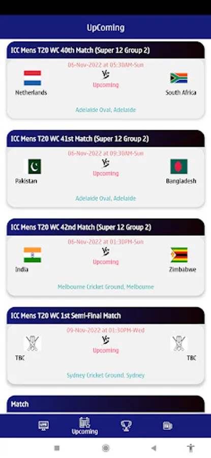 Get live scores for all International Cricket Teams: India (IND), Australia (AUS), New Zealand (NZ), South Africa (SA), England (ENG), Afghanistan (AFG), Pakistan (PAK), West Indies (WI), Sri Lanka (SL), Bangladesh (BAN), Ireland (IRE), Netherlands (NED), Zimbabwe (ZIM).