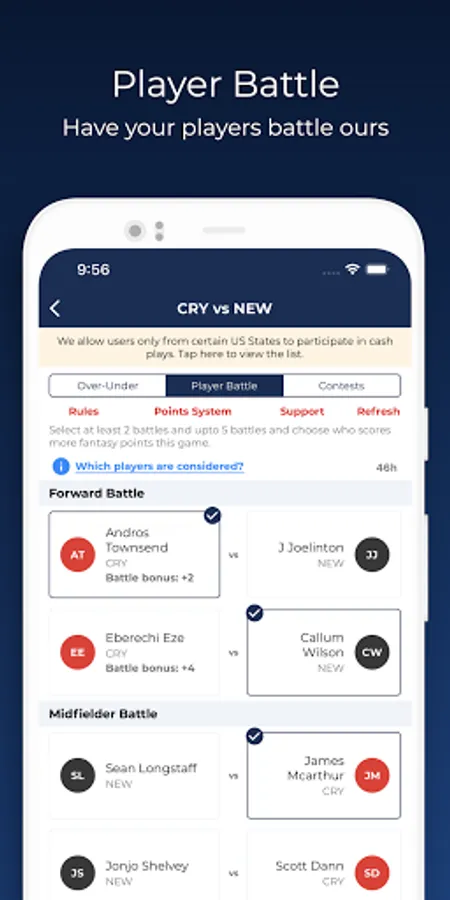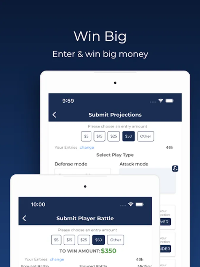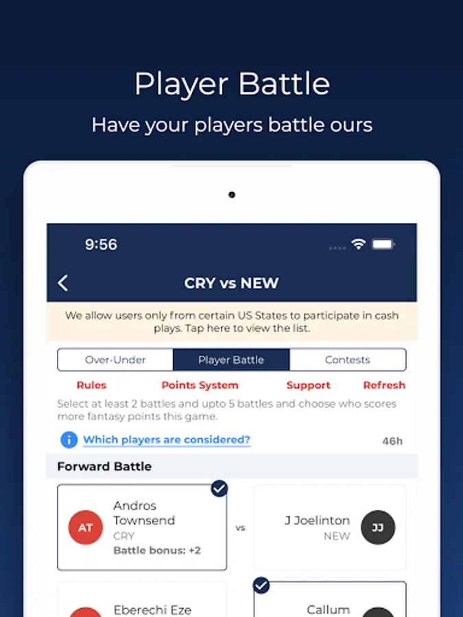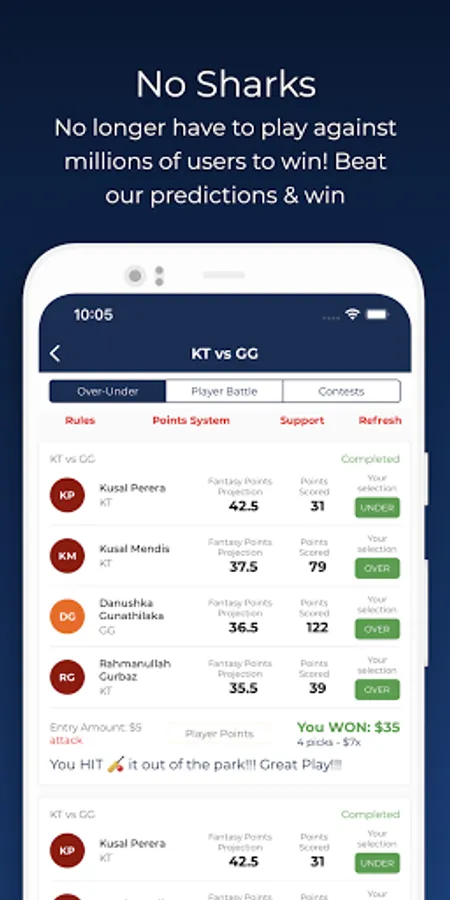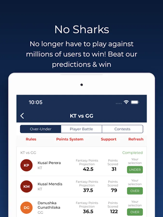• No need to setup 100s of lineups. Just select players who thinks will score points and win the player-battle.