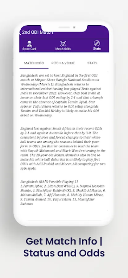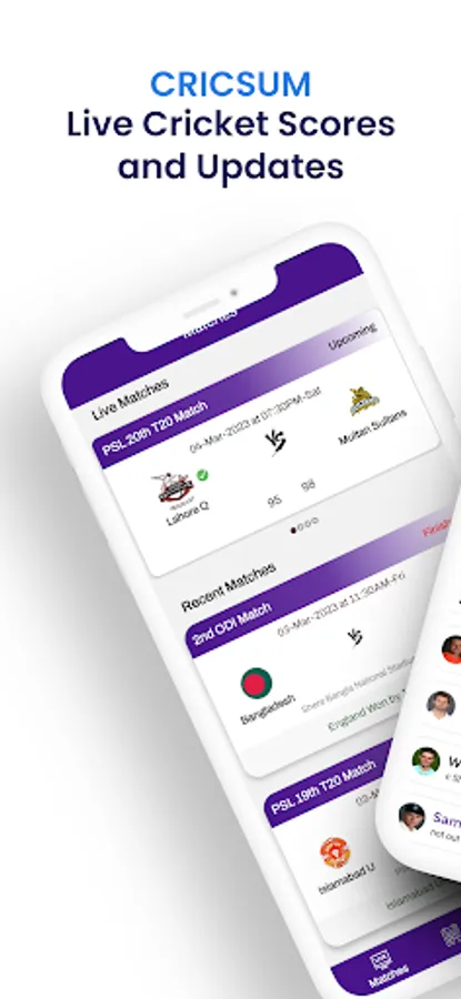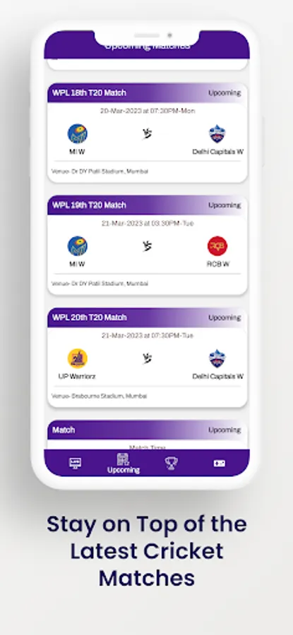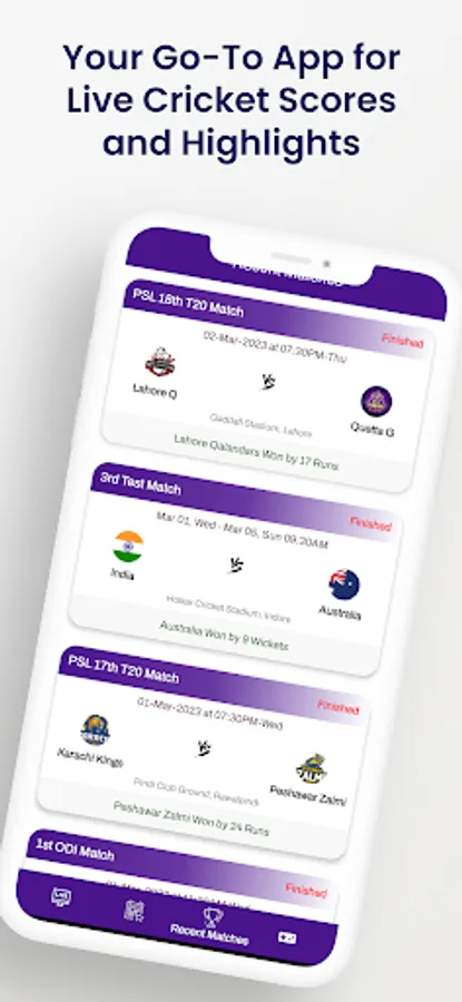 -> The Live tab offers easy access to all live matches, while the Matches tab allows you to browse upcoming and recent matches classified into T20, ODI, and TEST