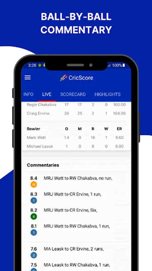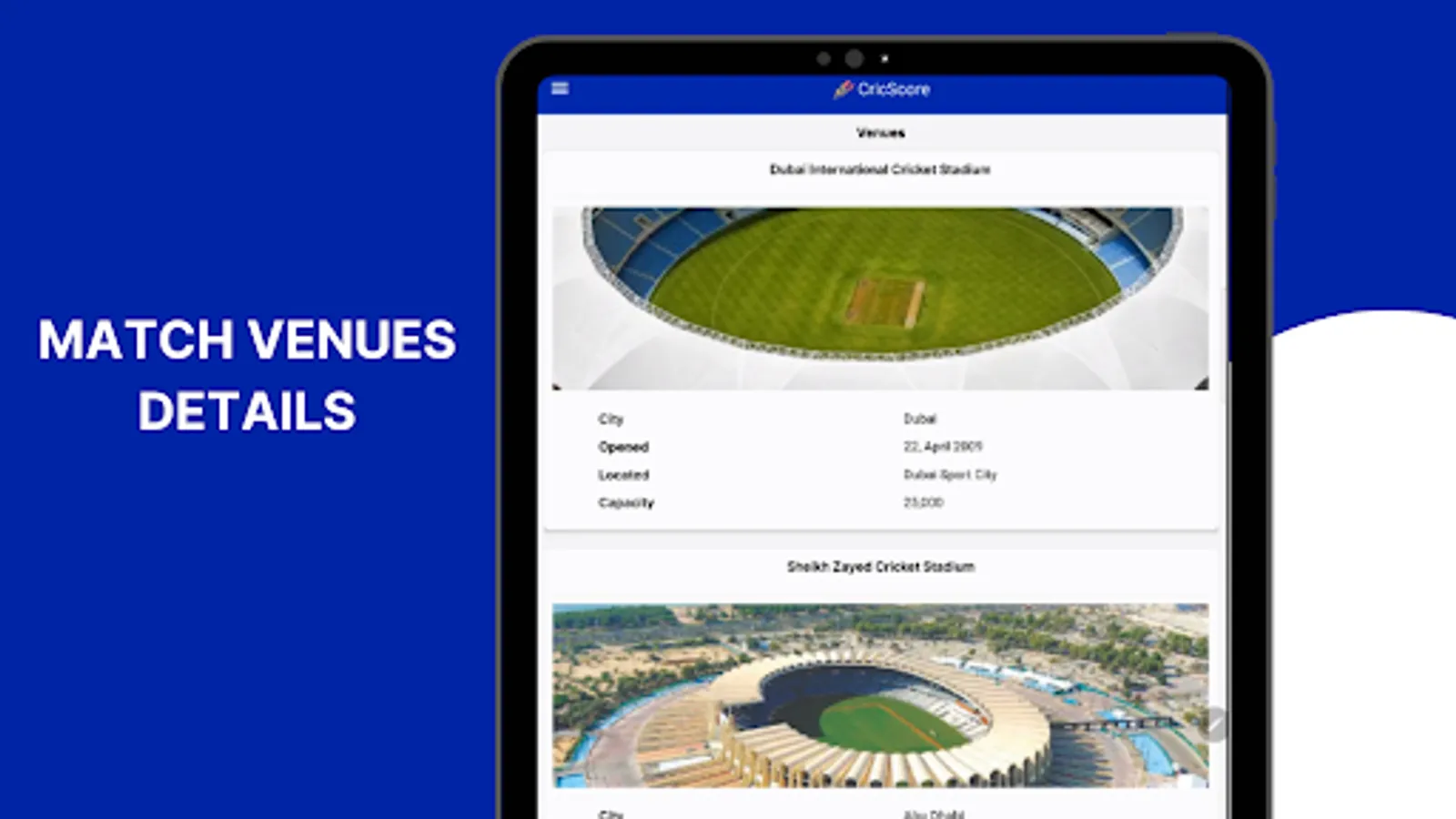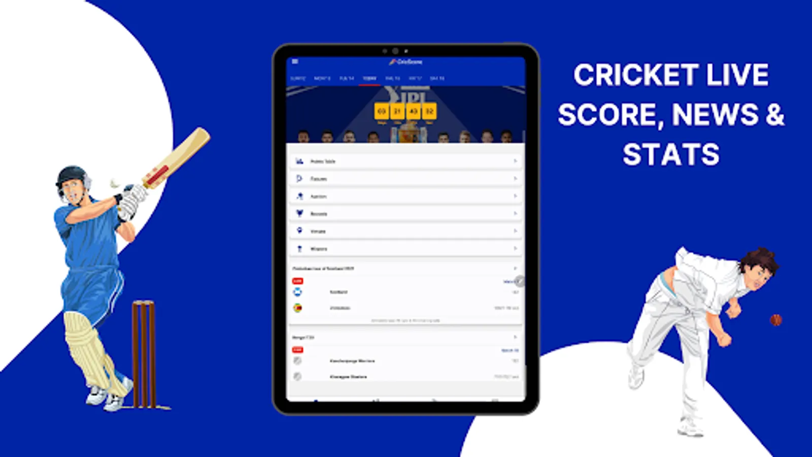 CricScore, Fastest Growing Cricket App on Google Play Store, App for all International Cricket Matches International, Domestic, First A Class, (Test, ODI & T20), Indian Premier League (IPL), ICC Cricket World Cup, Champions League T20 Provides ball-by-ball coverage of the Big Bash and other major domestic tournaments around the world.