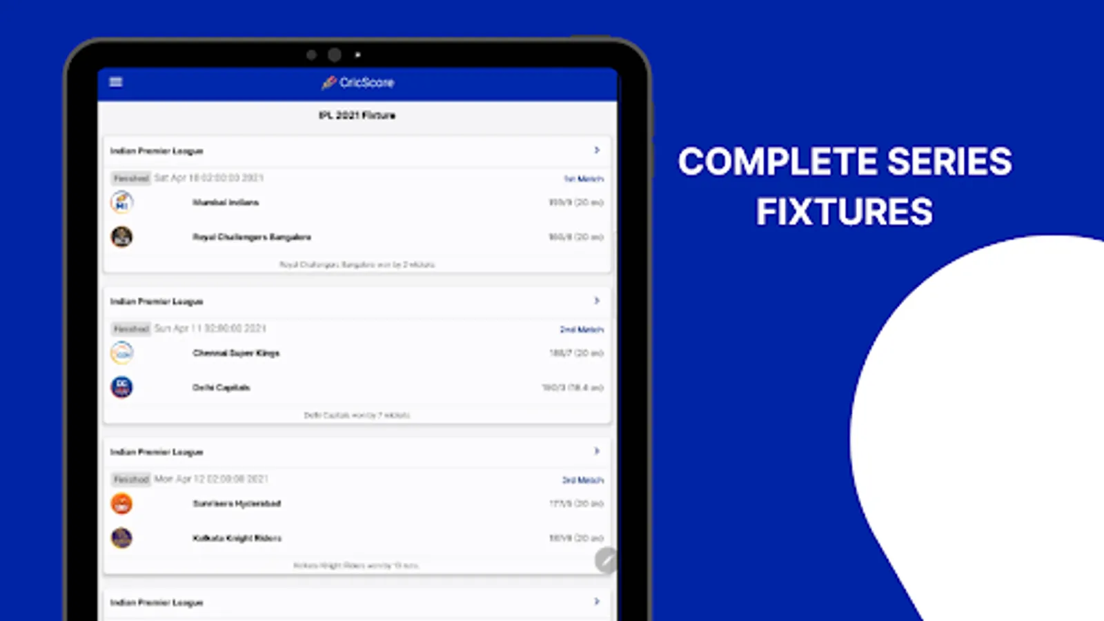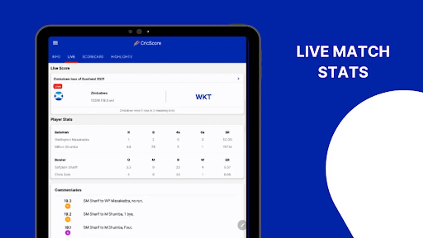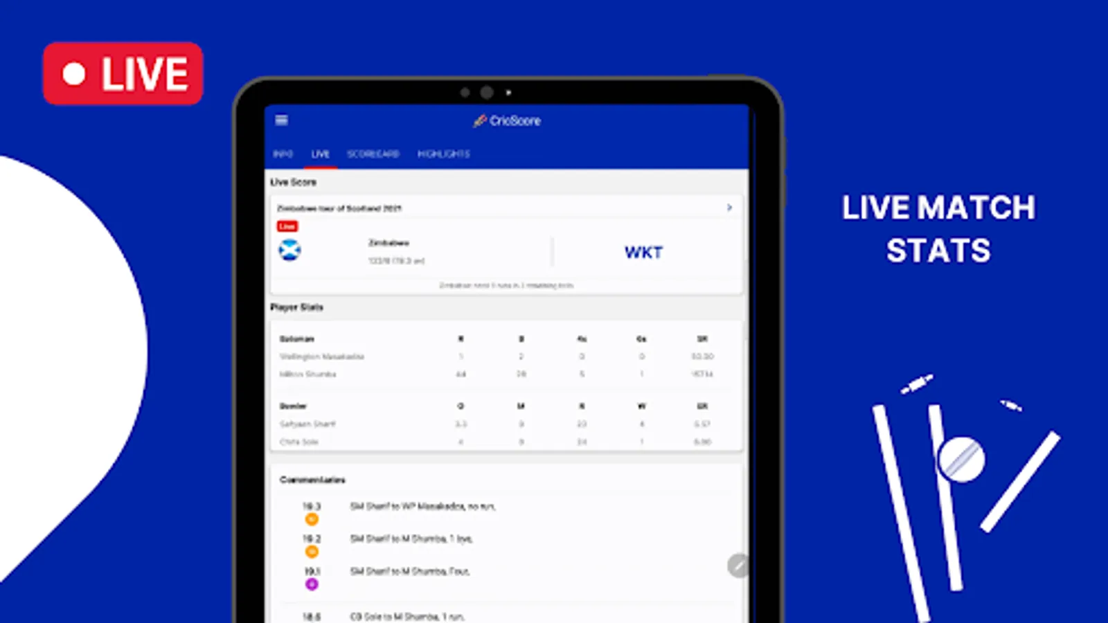 CricScore, Fastest Growing Cricket App on Google Play Store, App for all International Cricket Matches International, Domestic, First A Class, (Test, ODI & T20), Indian Premier League (IPL), ICC Cricket World Cup, Champions League T20 Provides ball-by-ball coverage of the Big Bash and other major domestic tournaments around the world.
