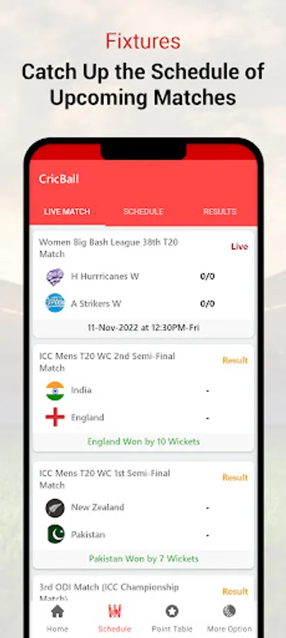 📅 Easy to find out from the schedule page with Current live matches in progress, Completed, International and domestic match categories.