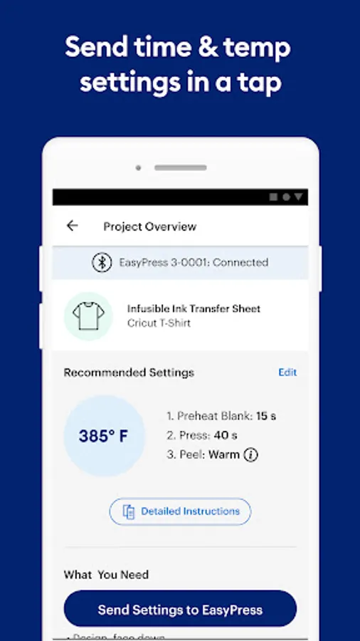 Get ideal time and temperature settings for virtually any heat transfer (HTV) project – and send them right to your press in a tap – with this companion app for Cricut EasyPress® 3 and Cricut Hat Press™ smart heat press.