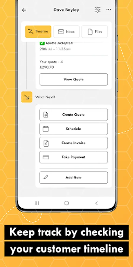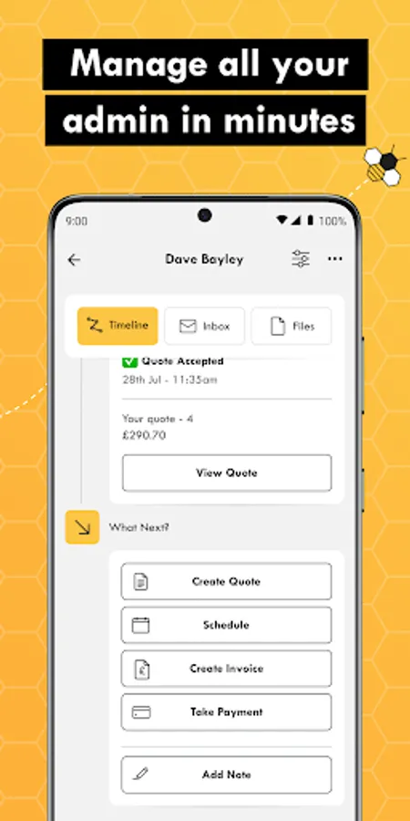 BeePro enables you to manage all of your jobs and customers through your customer timeline and linked email inbox. Use BeePro to quickly create professional quotes, invoices and take payments then and there.