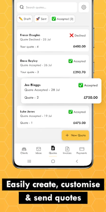 INVOICES: Turn existing quotes into invoices — or create a new one and email your client in seconds. Instantly check what you’re waiting on from any customer and reduce the need to chase. Just like quotes, invoices can be customised to fit your business. Payment can be taken if you have a Stripe account linked to BeePro. This is a fast and secure way to take payment on your phone. Alternatively, you can simply record if you've been paid by cash, cheque, or bank transfer too!