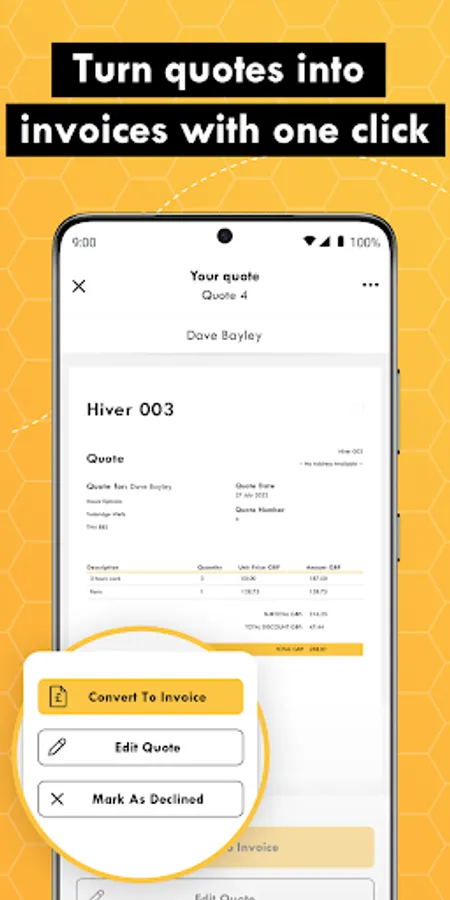 QUOTES: Create quotes in minutes from line items or a custom template. Add VAT, margin and discounts before sending quotes straight to your customer for approval. Our flexible quote-builder lets you add your logo and colours to make professional and comprehensive quotes with full cost breakdowns. When the job is done, you can turn the quote into an invoice with one tap.
