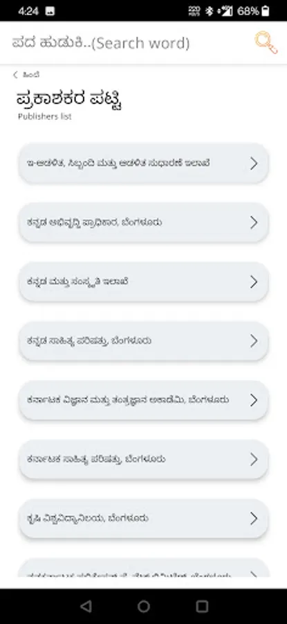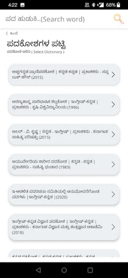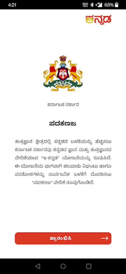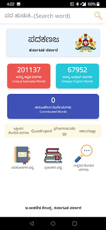 Padakanaja Mobile app is a collection of comprehensive and authoritative dictionaries. It is an official mobile app of Government of Karnataka in order to smoothen the implementation of Kannada in Govt Administration and for public usage. This app provides unified single window to access multiple lexical resources such as various Departmental Glossaries / Dictionaries published by Govt and Private publishers.