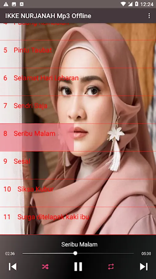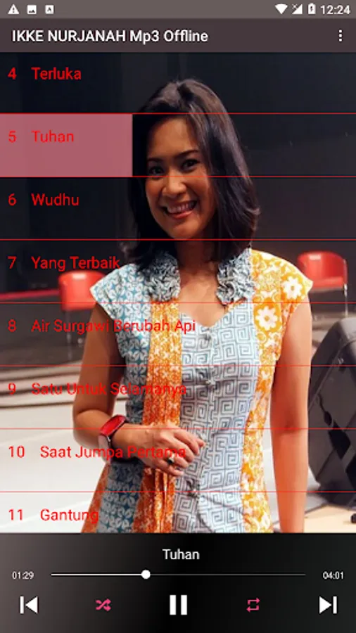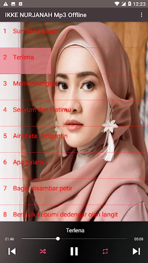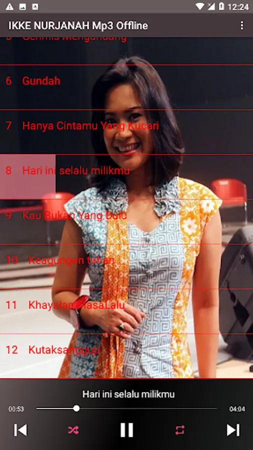 The following are some of Ikke nurjanah's songs that are very popular and most of them are found in this application: Sun Sing Suwe, Terlena, Looking at you, ojo suwe suwe, bride's tears, heavenly water, like being struck by lightning, my heart is pounding, the blue is longing, not my soul mate , dahlia flower, love and dilemma, black love, love until here, bracelet alit, wave of sorrow, drizzle invites, upset, should I survive, this heart is always yours, a broken heart, rain, this you know mas, falling in love, the majesty of God , memories, longings, past fantasies, white doves, hypocrites, moonlight fields, doors of repentance, the first meeting, always yours, alone, drifting in intimacy, humiliation, complacent, hurt, ablution, heart's dream, don't hold it first.