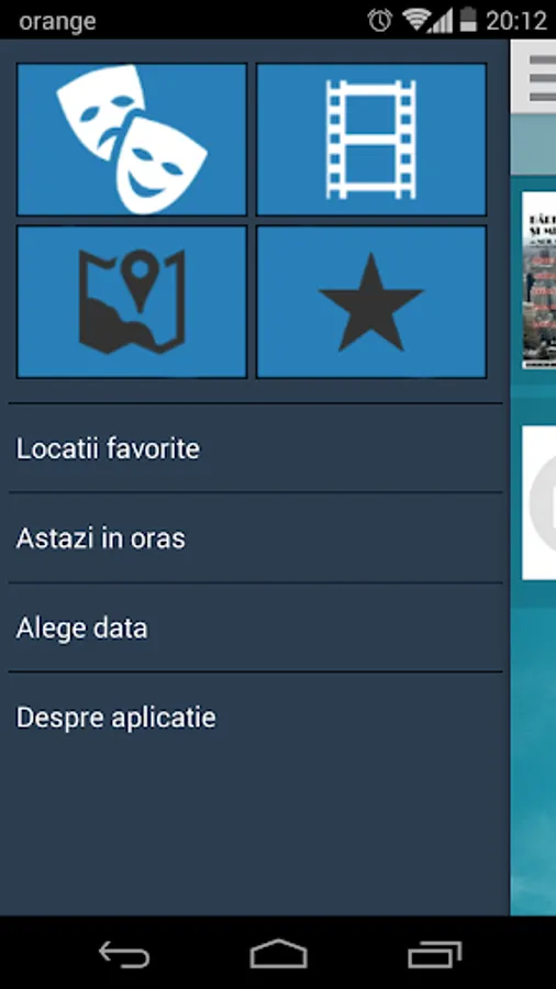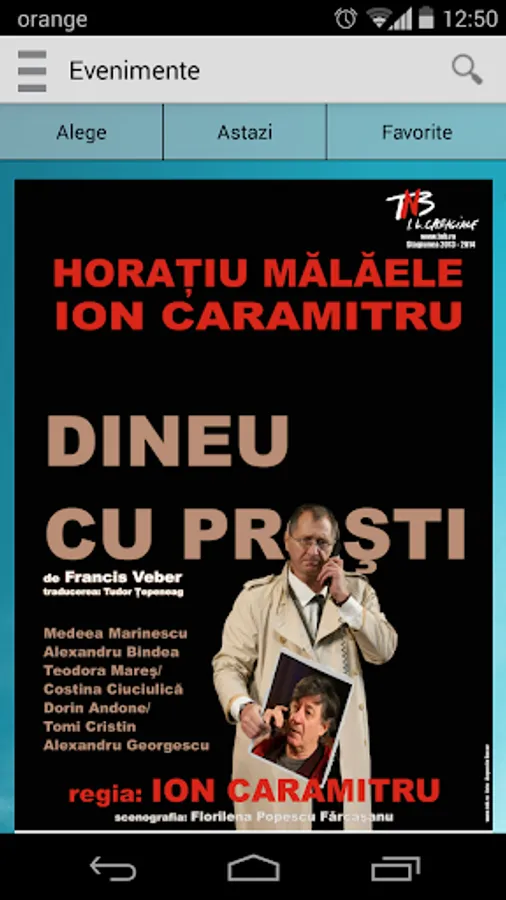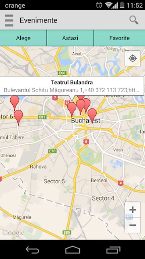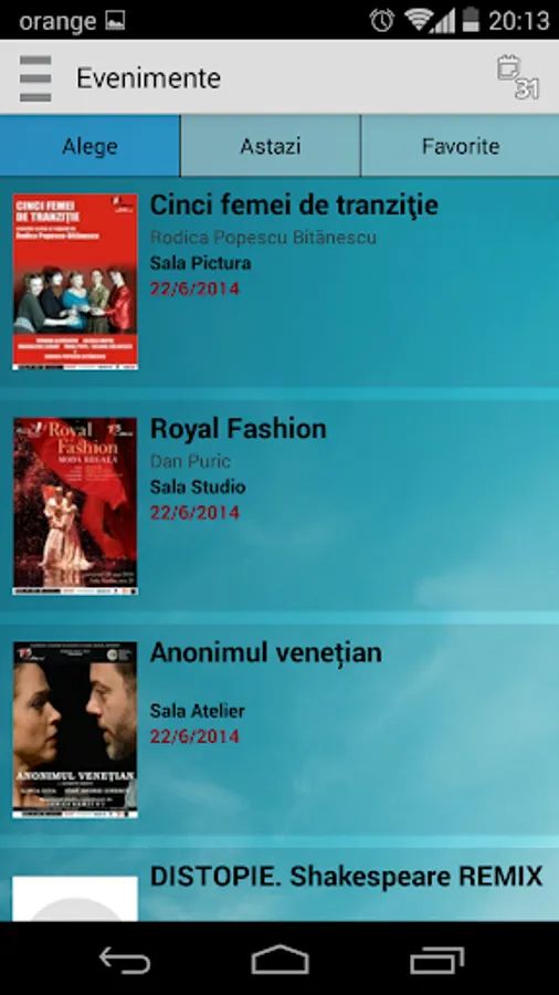 The application locates and displays drama and movies in the city of Bucharest, based on user selection. It will be able to select the date that wants to show these events or upcoming events to take place even in the day.