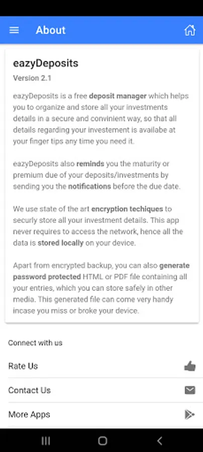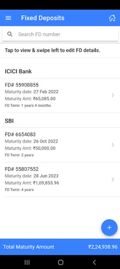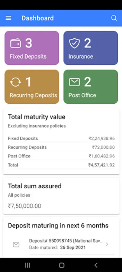 eazyDeposits is a simple but intuitive deposits manager. It's free and essential tool for managing all your fixed deposits, recurring deposits, insurance policies and post office deposits. This app will keep the track of all your deposits maturities and will notify you on and before the maturity date.