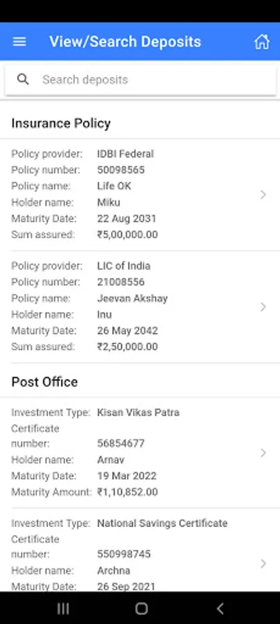 You can view all maturities year wise and month wise on a single screen, which will help you to organise with your financial planing. eazyDeposits will definitely help you to organize all your deposits belonging to different banks, insurance providers or post office at one place.