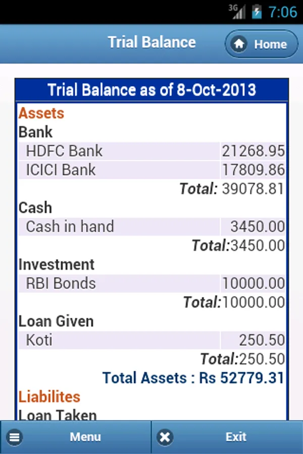 eazyMoney tells your financial status at any given point of time. You can always know how much you have in your bank & cash account and how much you have spent in each account (of expense group). eazyMoney also tell you about your investments.
