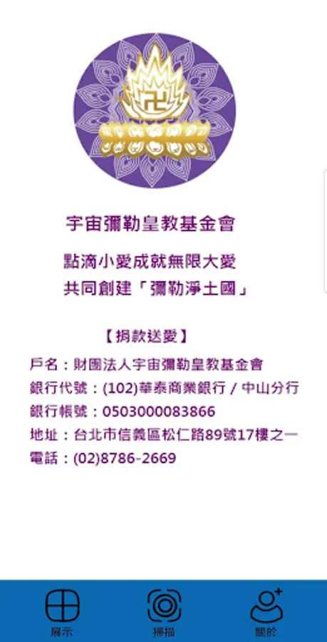 "宇宙彌勒皇教基金會APP"分為三個部分: