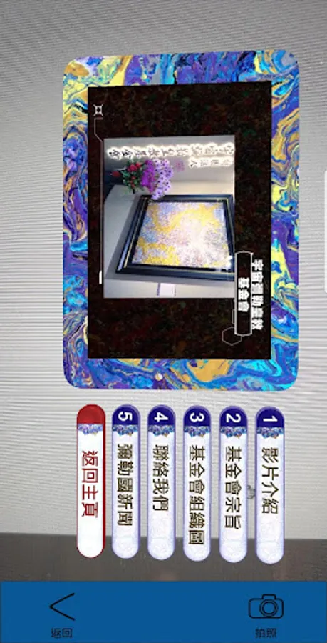 AR虛擬按鍵有:影片介紹/基金會宗旨/歷年展覽/課程師資/藝術據點/聯絡我們…等虛擬按鍵.