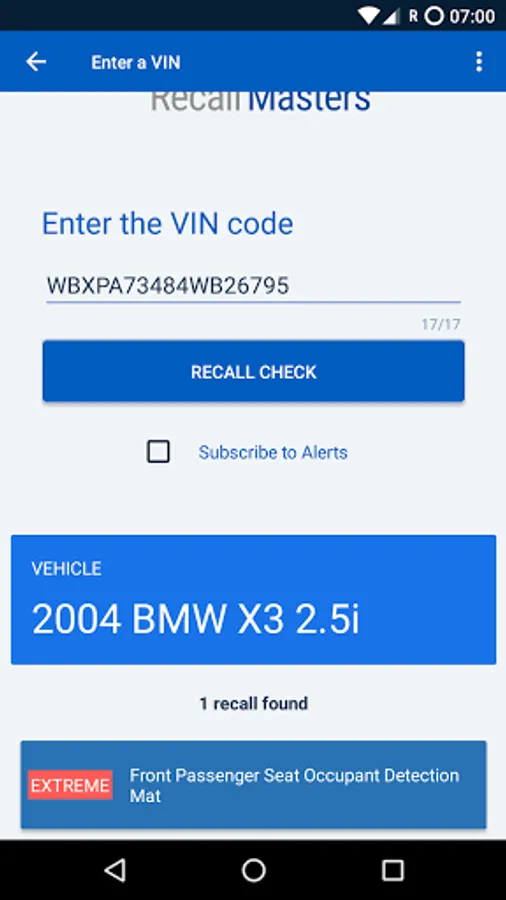 The Recall Masters Mobile Application is a licensed product from Recall Masters that allows consumers and organizations to use our VIN Check functionality to check vehicles for open recalls on the fly any time it is needed. This includes at an auction prior to purchasing and bringing the VIN’s into current inventory, in the service bay before a service RO is created and completed, or when a customer wants to trade in a vehicle during the purchase cycle to estimate trade in cost. This helps our clients ensure they are not purchasing vehicles at that cannot be sold due to current open recalls with no remedy or parts available and that all open recalls are found while a customer is at the dealership for any reason. The consumer application also allows user to sign up for email and text alerts so they will can choose to receive a notice any time a new recall is found on their vehicle.