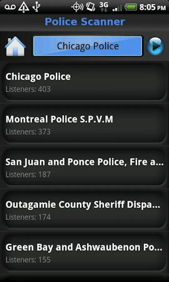 Police Scanner 5-0 brings you more than 5,000 police, fire, rescue and other radio feeds over 3G or WiFi. You can search for channels in the U.S. and other countries by country, state or province and county. Find channels close to your location based on GPS or 3G/WiFi triangulation. You can save your favorites, listen in the background, and get instant access to new feeds as they come online.