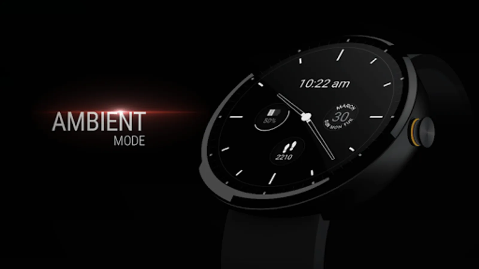 This interactive clock face for Android Wear does what you've come to expect your analog smartwatch to do: tell time. This is done with an analog tic toc watch like those you have seen on the wall and may have learned to read in grade school. It has an hour, a minute hand, and when in active mode, shows a second hand that ticks.
