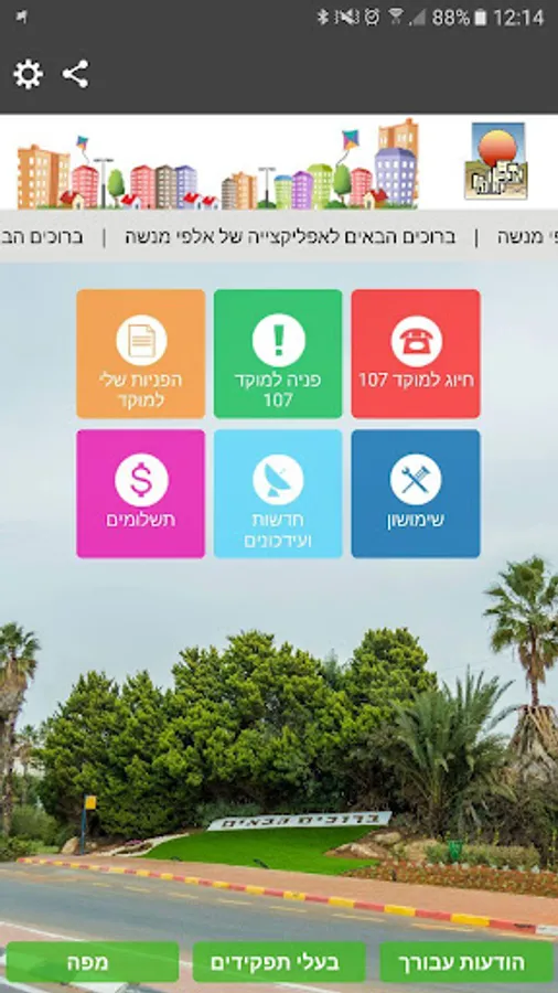 Alfei Menashe residents enjoy the new app updates Hmngish and another beam in the community. Touch of a finger you will receive the following services: regular updates on cultural activities and community settlement, a map with points of interest, opening a U-emergency rapid municipal hotline 107 with photo hazards and monitoring, making direct contact with the various departments of the Council, convenient payment of bills such as property taxes, etc.