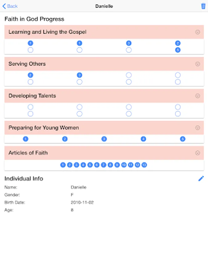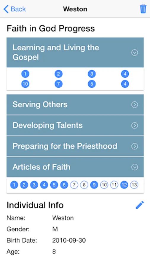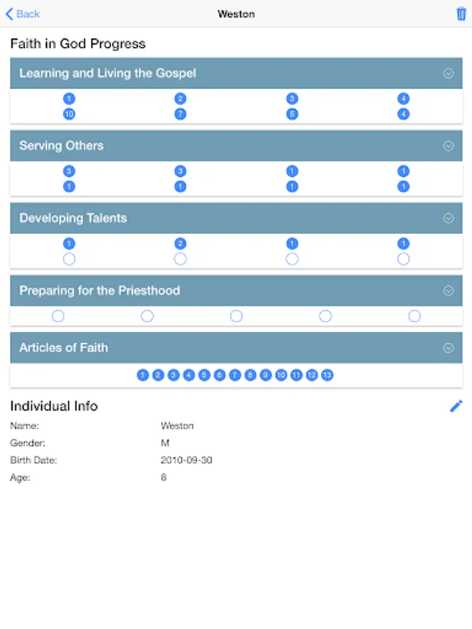 - View all of your children individually. Get a detailed view of each child and record Faith in God progress.