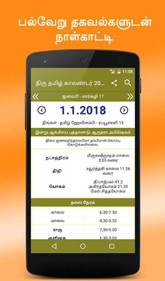 Now, Users can select any date and get information for that particular date using this Tamil daily calendar 2023 (Naal Kaati App). Using the next and previous arrow in daily view, get the next day and next month first day details. Day view includes lot more information like Today History, Rasi Palan, Proverb etc..