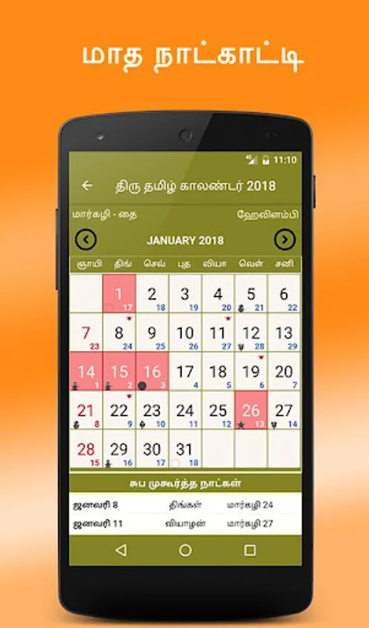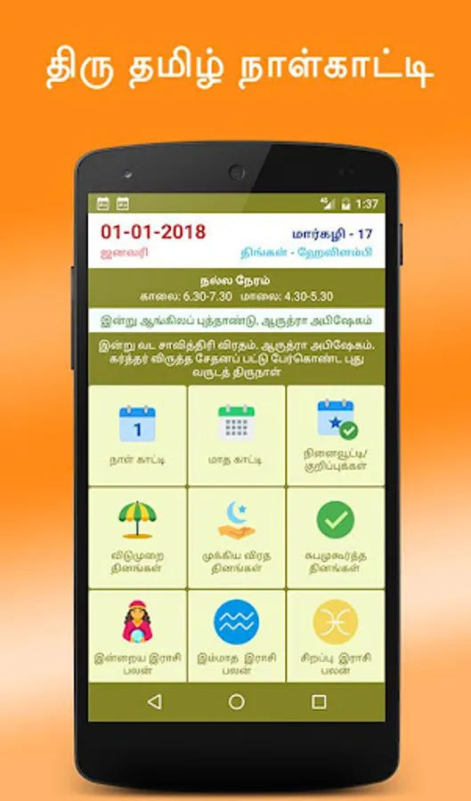 "Thiru Tamil Calendar 2023" offline App provides complete details of auspicious days, Subha Muhurtham days, Nalla Neram, Raagukaalam, Yamagandam, Kuligai.
