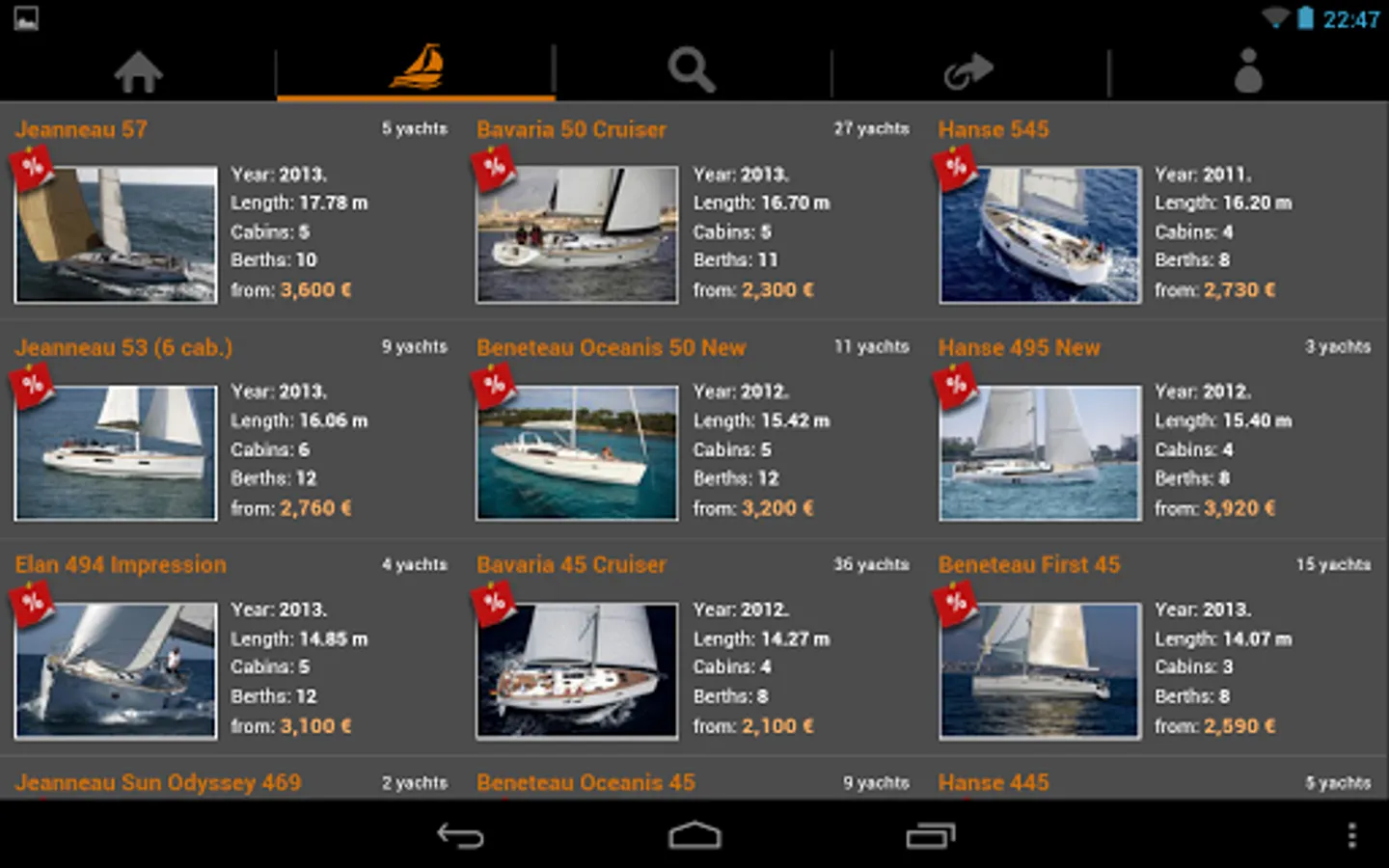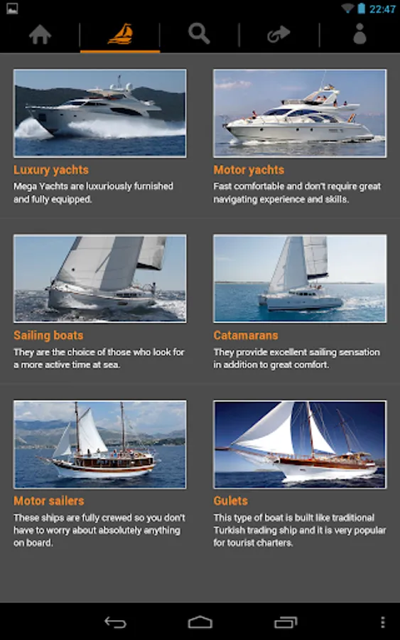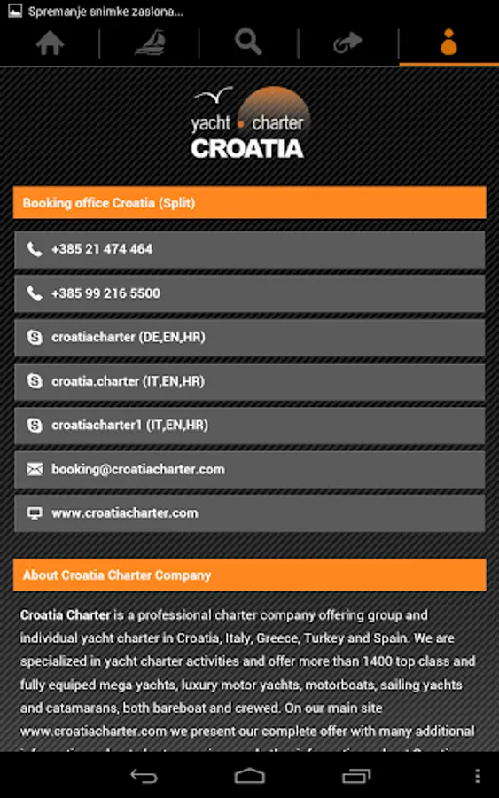 Yacht Charter Croatia developed a mobile application optimized for Android phone and tablet for booking a perfect holiday in Croatia with more then 2500 boats available in different regions along Adriatic coast. Application presents all type of boats available for charter in Croatia along all basses on the Adriatic coast that consist of motors yachts, sailing boats, catamarans, luxury yachts, gullets and motorsailers. It is available in multiple languages and it is very easy to use.