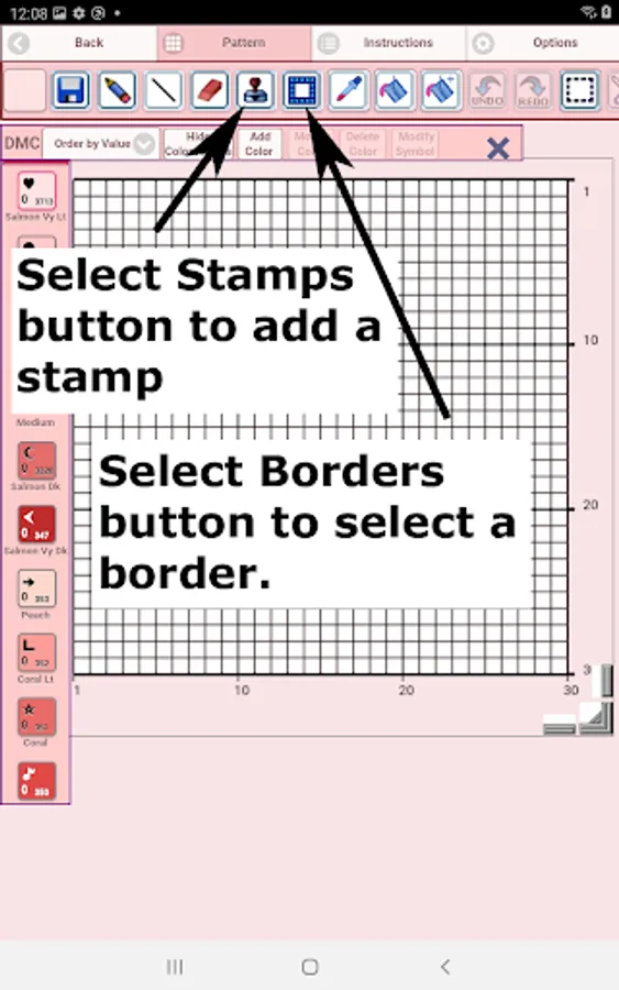 To get started - Use the pencil to fill in squares to your cross stitch pattern. Use the Eraser to clear filled squares from your cross stitch pattern.
