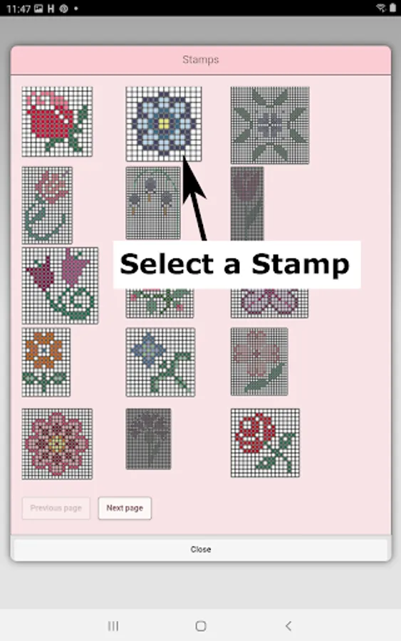 Stamps icon - selectable little stamps (little cross stitch designs) to add to your cross stitch pattern