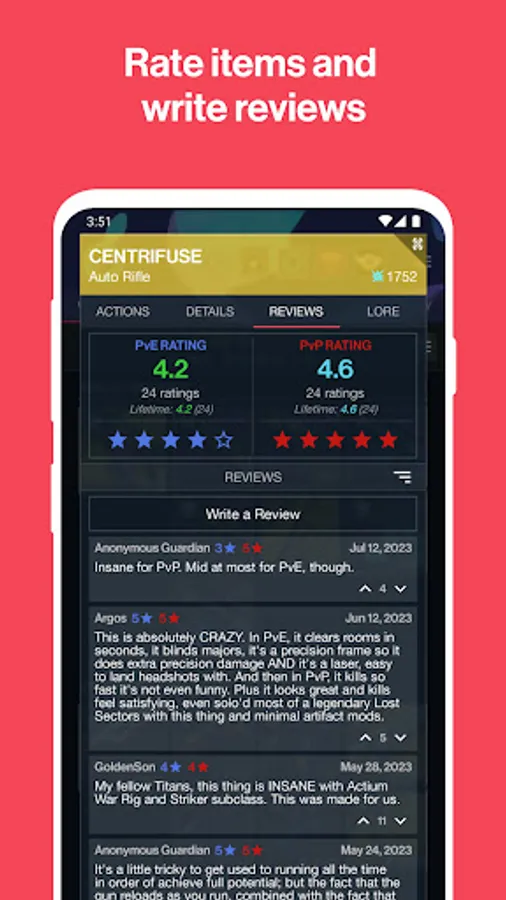 - Advanced Item Ratings: Say goodbye to generic ratings! In The Vault 2.0, users can now rate items separately for PvE, PvP and cosmetic purposes. Provide specific feedback based on different play styles and assist the Destiny community in creating a more personalized and informed rating system.
