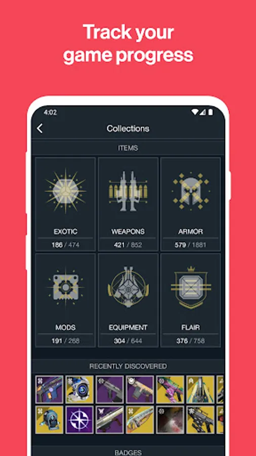 - Collections: Easily view and manage your vast collection of weapons and armor. Keep tabs on what you have, what is missing and explore the full potential of your arsenal.