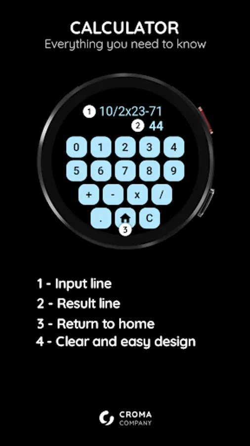 Our calculator has been carefully optimized to fit round watch screens. The user-friendly design ensures you'll never miss a key or press the wrong number, making calculations a breeze on even the smallest of screens. The live result display allows you to see the solution as you type.