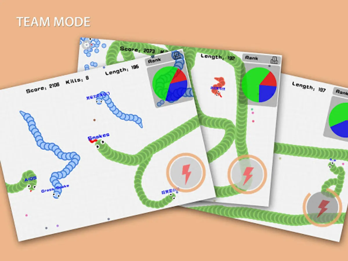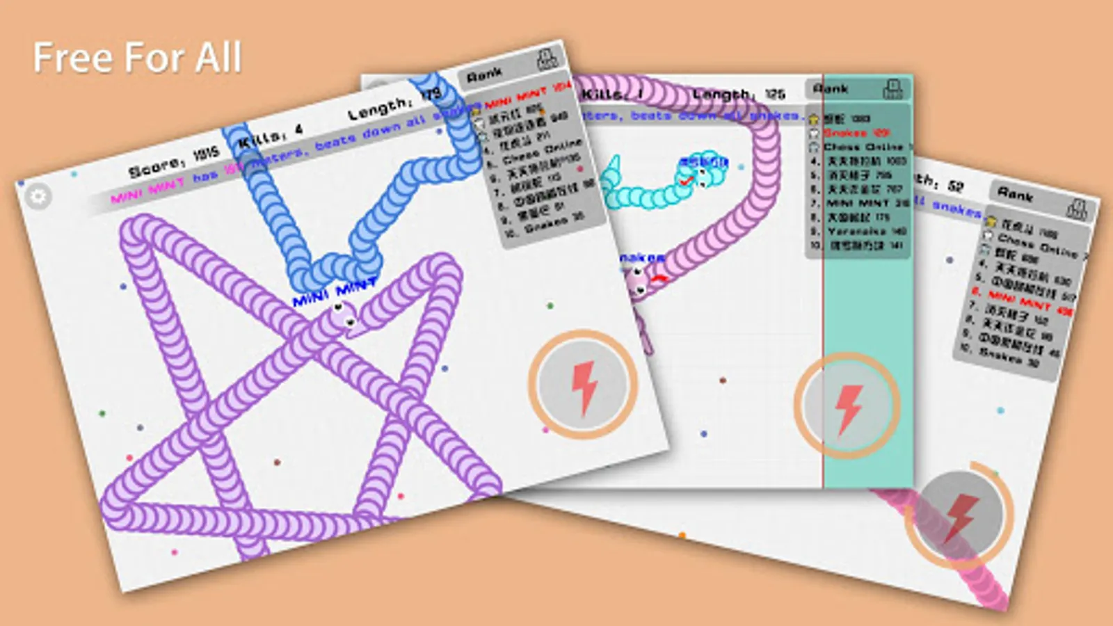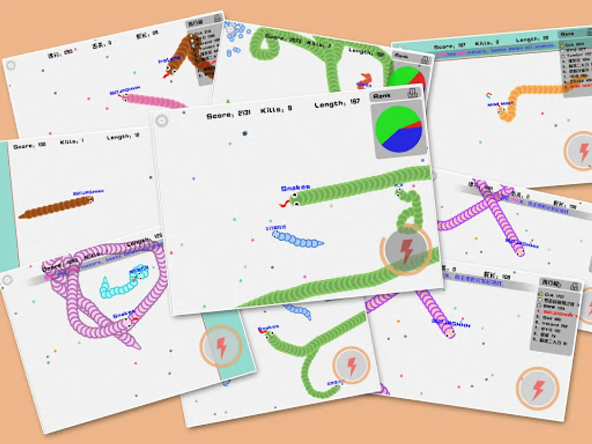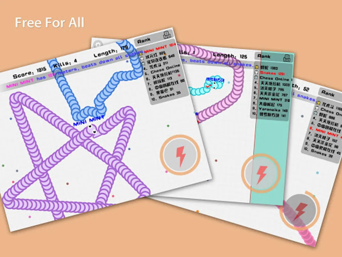 1) move snakes in 360 degree, each snake can touch itself, better to wreath around other snakes,a gentle turn can make sudden death
