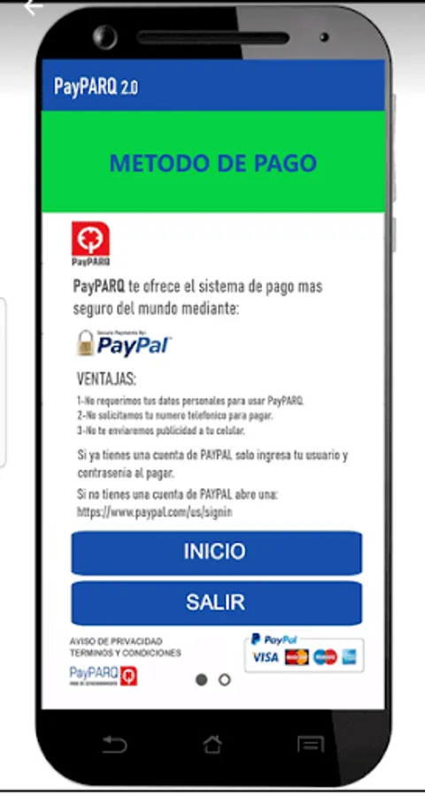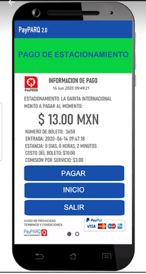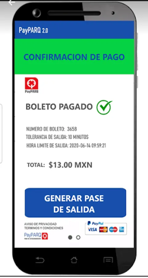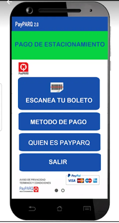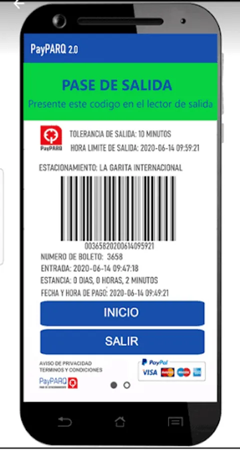 Through PayPARQ, you can pay for the parking service using this application with your PayPal account. Once you have your active PayPal account just scan your ticket, pay for the service and you will get a virtual ticket or exit pass that you can use in the next few minutes to leave the parking lot showing the barcode on the exit validator.