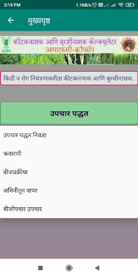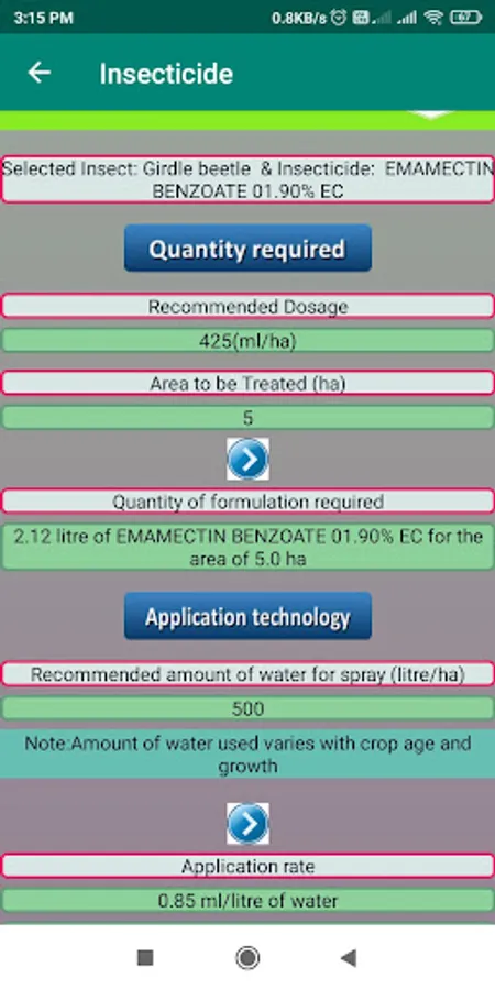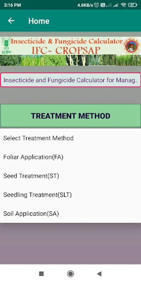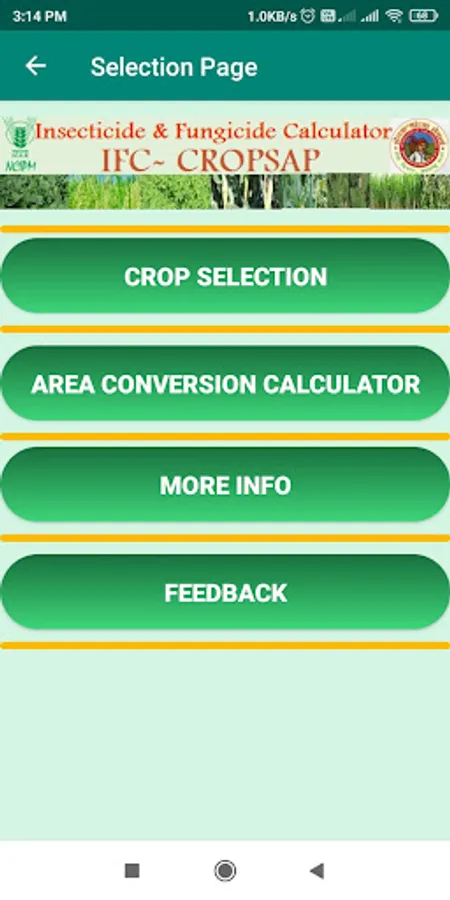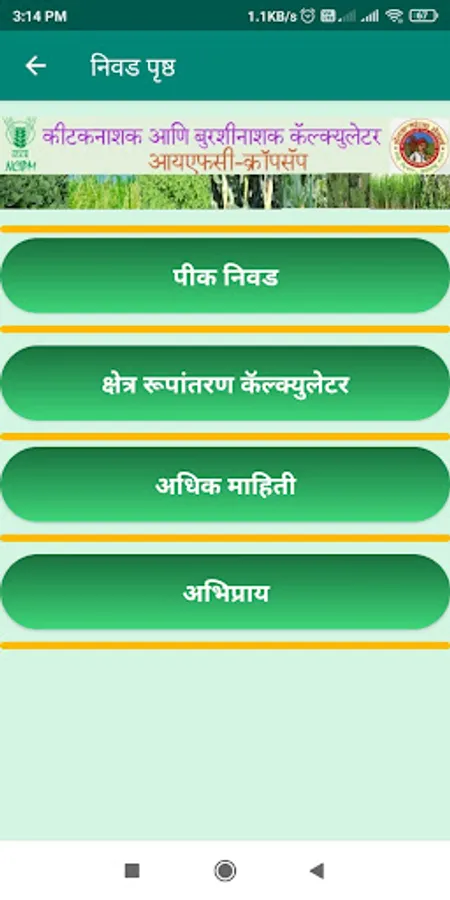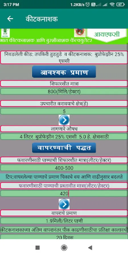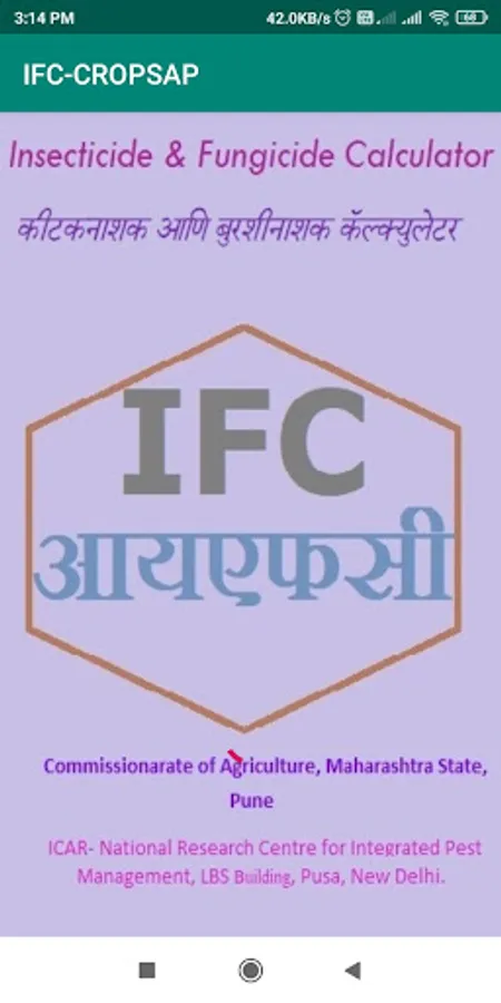 Therefore, considering the current status and recommendation pathways of pesticide use in India and the potential outreach of digital technology, an android application for insecticide and fungicide calculations named ‘Insecticide and Fungicide Calculator’ (IFC) for six i.e. Soybean, Rice, Cotton, Maize, Pigeonpea & Chickpea has been developed. The insecticides and fungicides recommended for insects and diseases along with their dosages, the volume of spray fluid to be used and the waiting period besides additional information was compiled from CIBRC. A miscellaneous function of the area converter in the app operates independently. ‘More info’ provides details on the source. The ‘Feedback’ button allows users to interact with the developer of IFC through an inbuilt email address when ‘online’. The current version of the application provides information in English and Marathi languages to the user.