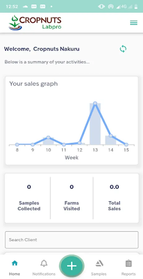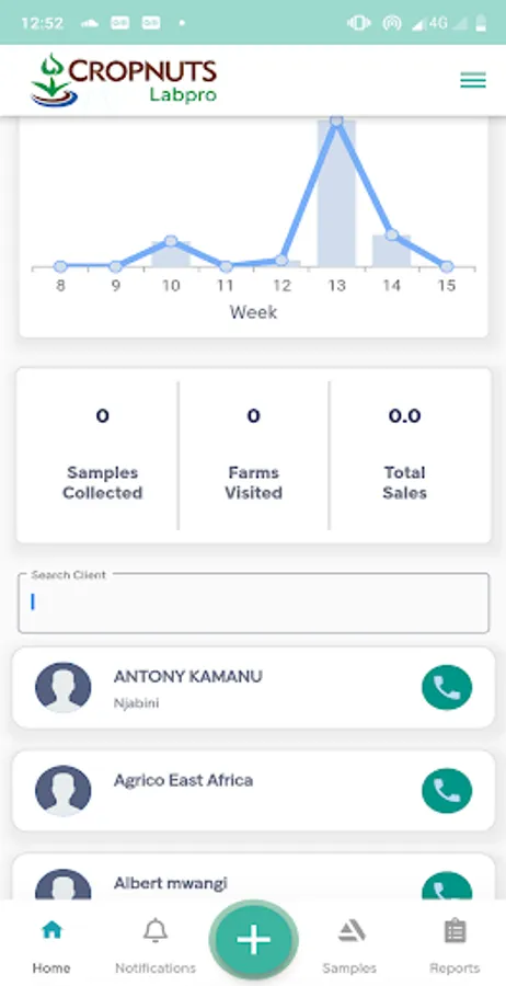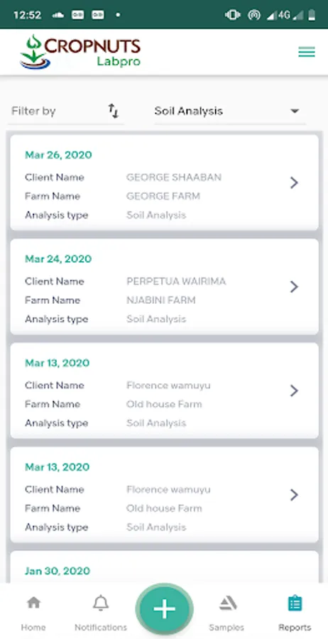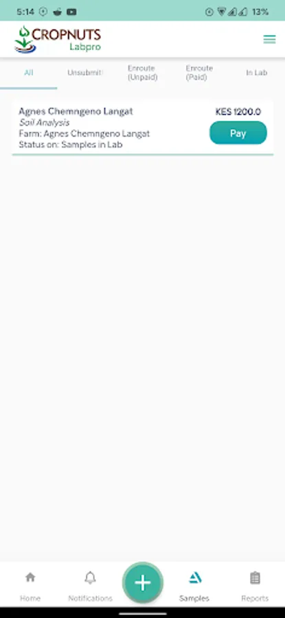 The app guides the agronomist through the sample collection process, selection of the specific type of analysis required, pricing, payment, and provides the full lab report that can be shared with the client.
