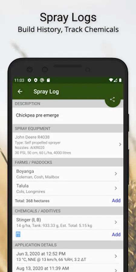 • Spray Logs - Record all relevant details for spraying. Includes a load calculator and remote lookup of weather stations.