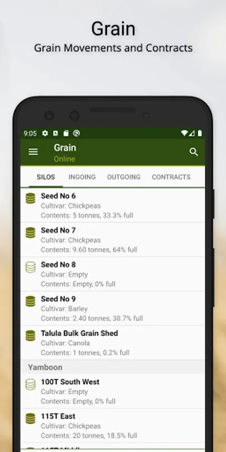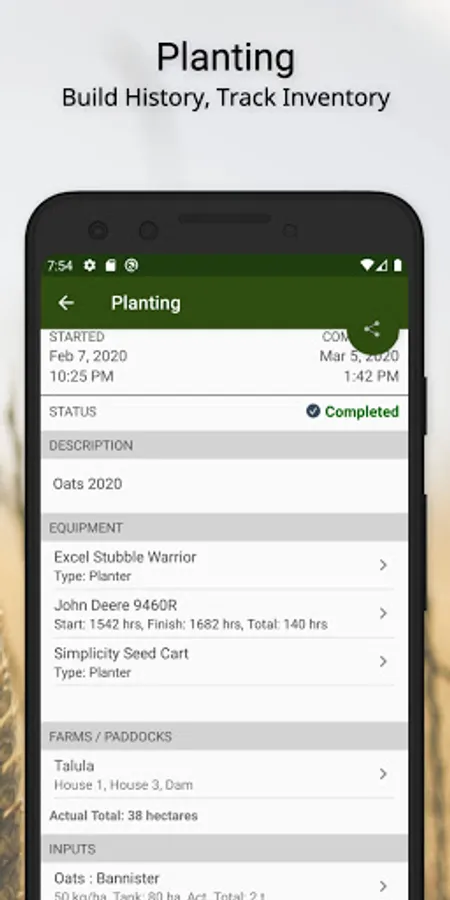 • Inventory Management - Track ingoing and outgoing Grain, Fuel, Chemical, Fertilisers and Water. Enter grain contract details to track fulfilment. Assign fuel to an activity.